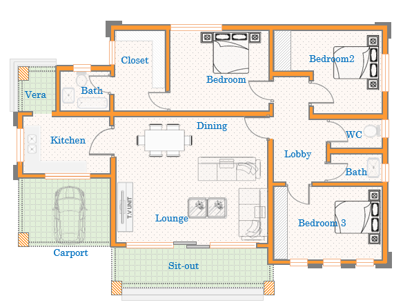 The House Plan design with three (3) Bedrooms, and other related rooms.